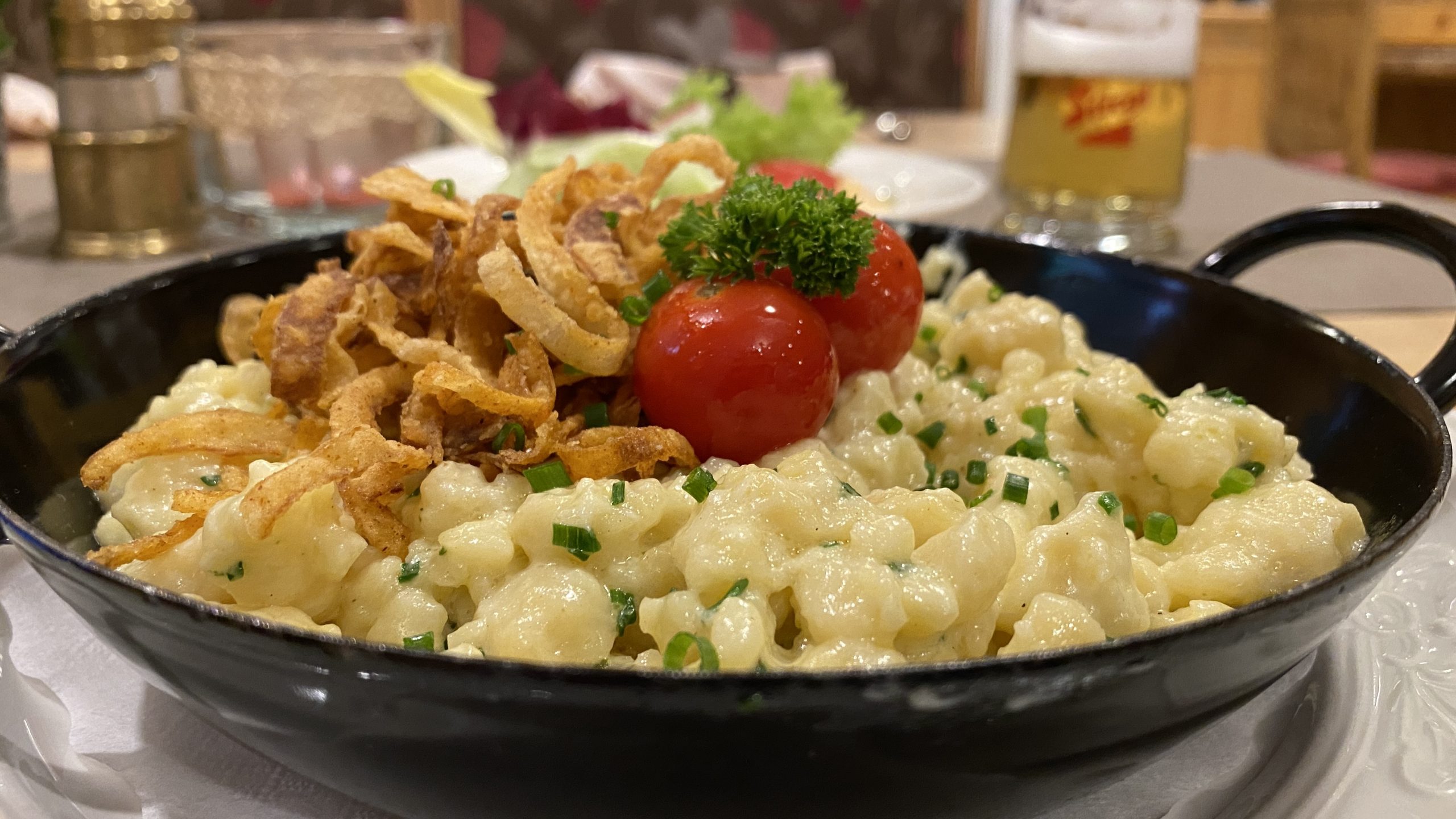 Zurück am Hotel standen in der Garage, in die sechs Autos passten, die aber vorne nur zwei Autos breit war, zwei Autos. Ganz vorne. So dass alle hinteren leeren Parkplätze erfolgreich versperrt waren und nicht mal ich mit dem Moped durchkam. Nach kurzem Palaver mit einem Hotelmenschen fand ich ein Plätzchen in der Fahrradgarage. Dann gab es Käsespätzle.